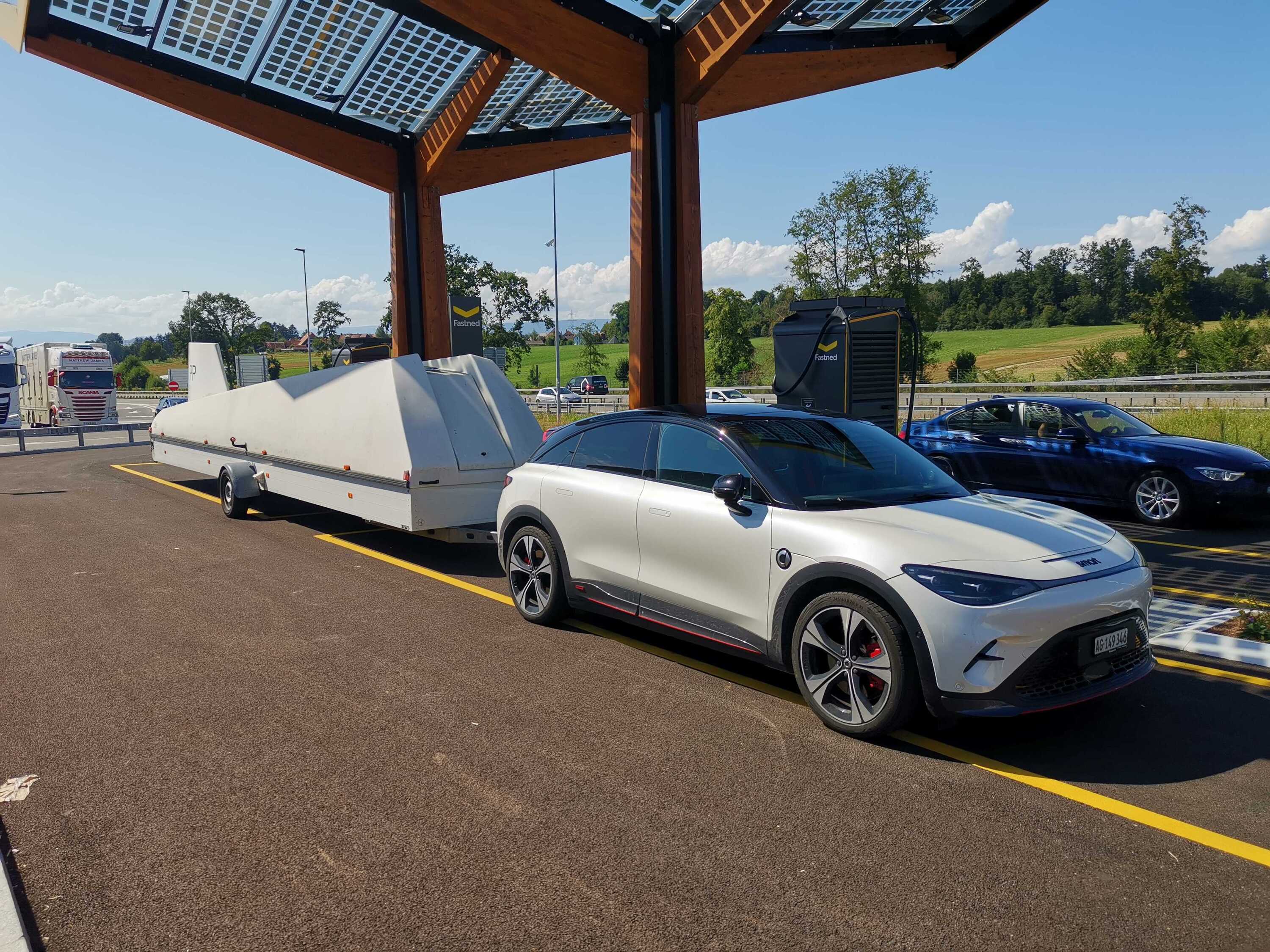 Mit dem Doppelsitzer (ca. 1300 Kg) am Hacken ca. 26 kWh/100km.